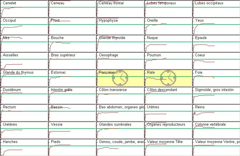 Les mesures au dessus le la ligne verte indiquent que l'organe se trouve en stress énergétique, en dessous, il y a faiblesse énergétique.